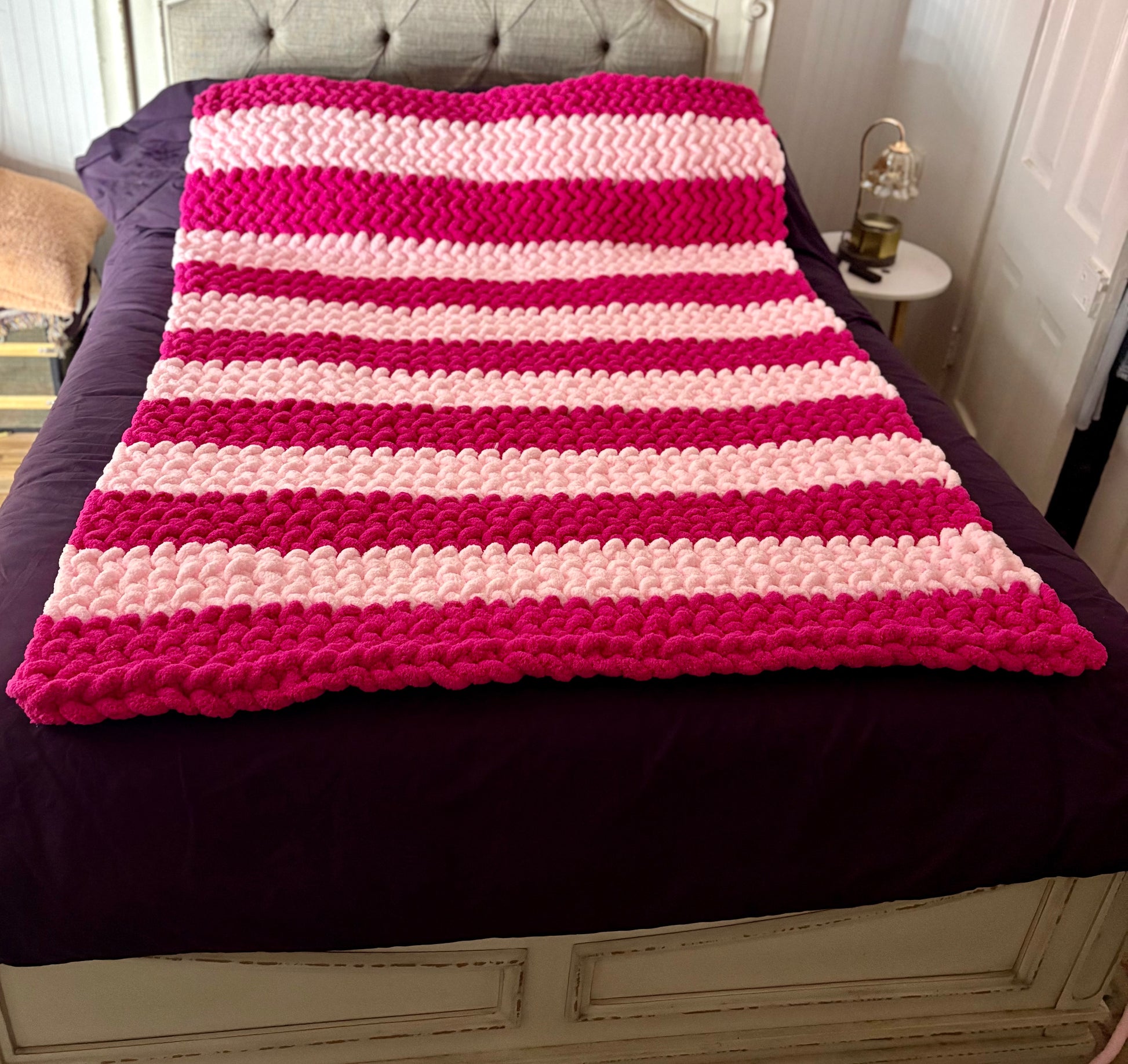 50x65 hand knitted chunky blanket- dark pink and light pink